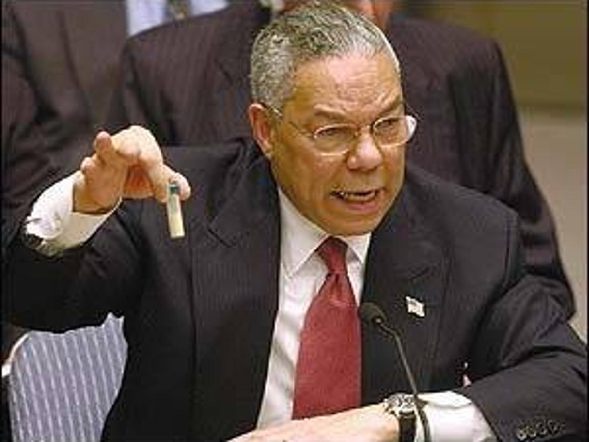 Secretary of State Colin Powell holds up a vial he said could contain anthrax as he presents evidence of Iraqs alleged weapons programs to the United Nations. WASHINGTON AP Colin Powell the trailblazing soldier and diplomat whose sterling reputation of service to Republican and Democratic presidents was stained by his faulty claims to justify the 2003 US. 5 2003 file photo Secretary of State Colin Powell holds up a vial he said could contain anthrax as he presents evidence of.